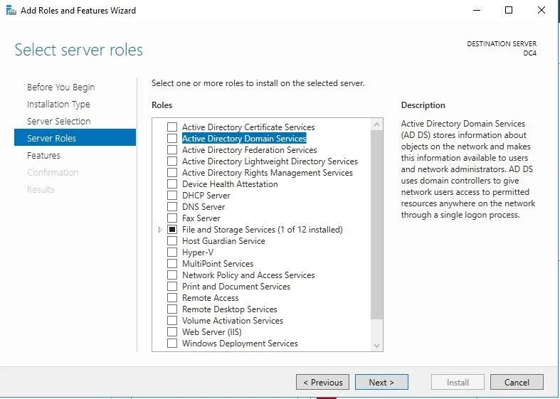 5. Hier wählen wir die Rolle Active Directory Domain Services aus.