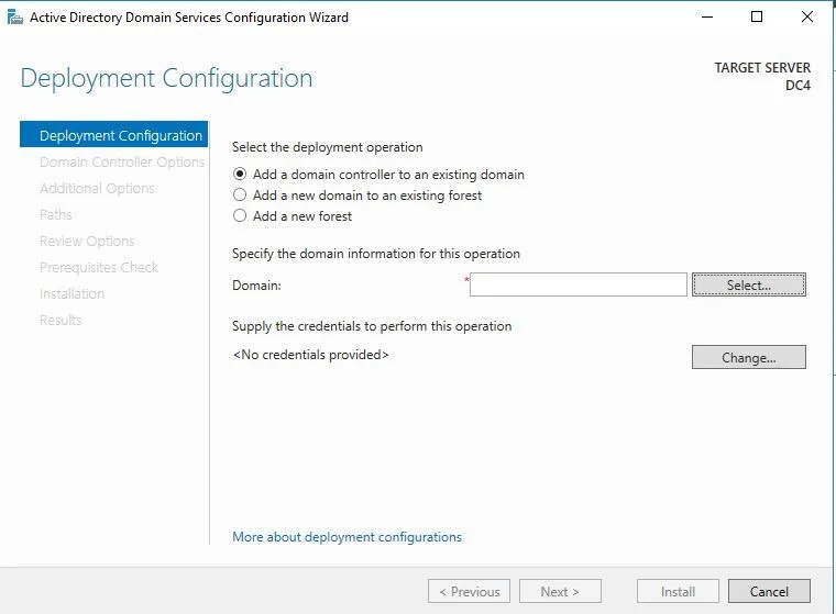 12. Im Deployment Configurations Fenster wählen wir als Operation Add a domain to an existing domain und klicken auf Select. Hier melden wir uns mit unserem Domainadministratorkonto wie folgt an: Domain\Administrator. Nun müsste sich ein Fenster öffnen, in welchem die gefundene Domain im Netzwerk angezeigt wird. Anschließend klicken wir auf Next.