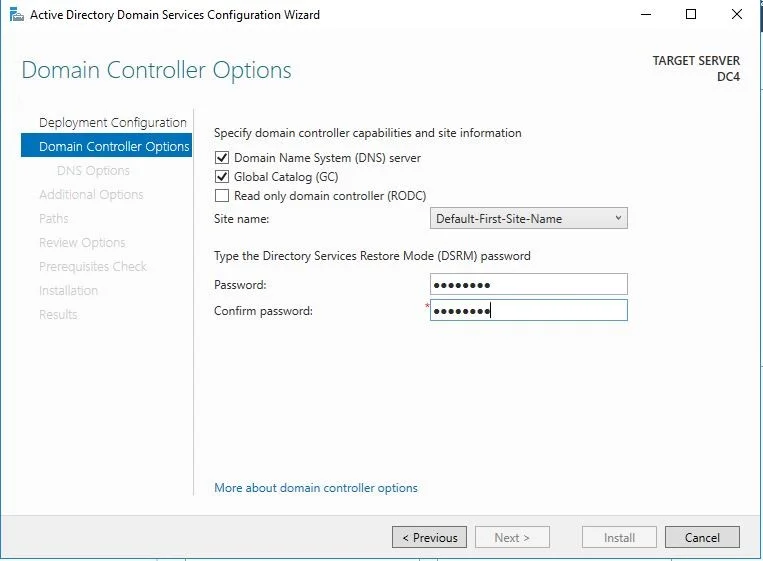 13. Auf der Domain Controller Optionen Seite überprüfen wir, ob die Haken bei Domain Name System (DNS) server und Global Catalog (GC) gesetzt sind. Danach erstellen wir unser DSRM-Passwort.