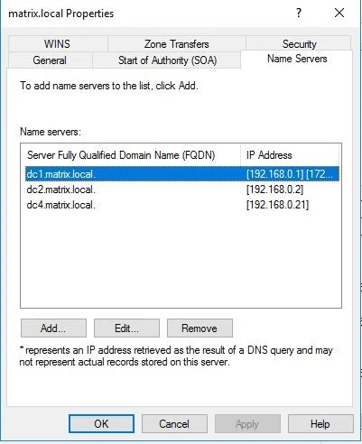 21. Im DNS-Manager überprüfen wir dies mit der Auswahl von Eigenschaften mit einem Rechtsklick auf die Domäne, hier matrix.local. Unter dem Reiter Name Servers können wir uns vergewissern, dass DC4 aufgelistet ist.